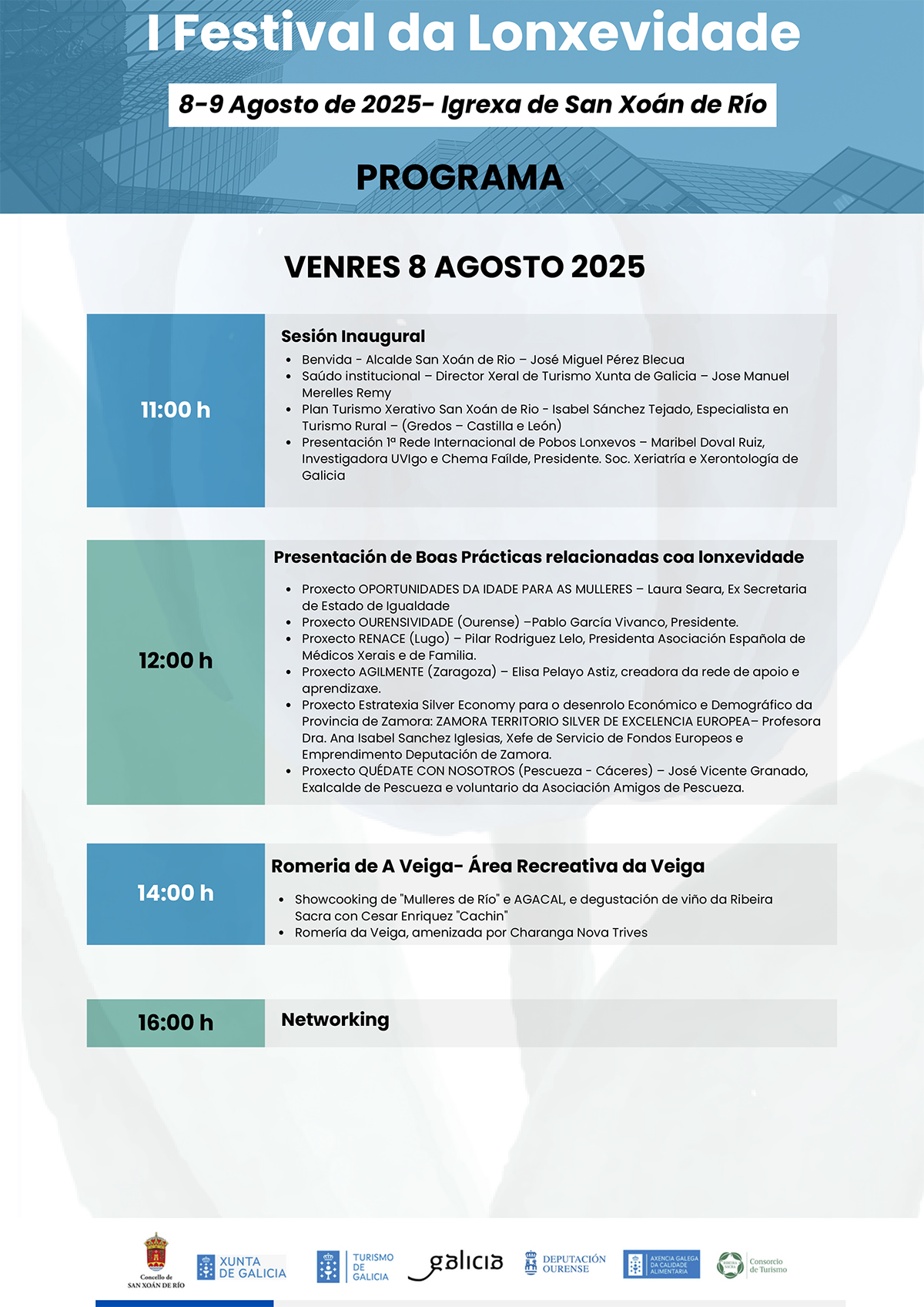El viernes 8 de agosto comenzaremos con un acto institucional que contará con la participación del alcalde, Xosé Miguel Pérez Blecua; del director de la Axencia de Turismo de Galicia Xosé Manuel Merelles Remy; la experta en turismo xerativo Isabel Sánchez Tejado (Escuela de Turismo Xerativo), y personas referentes como Maribel Doval Ruiz (Universidad de Vigo) y Chema Faílde (presidente de la Sociedad Gallega de Geriatría y Gerontología), que presentarán la creación de la 1ª Red Internacional de Pueblos por la Longevidad.