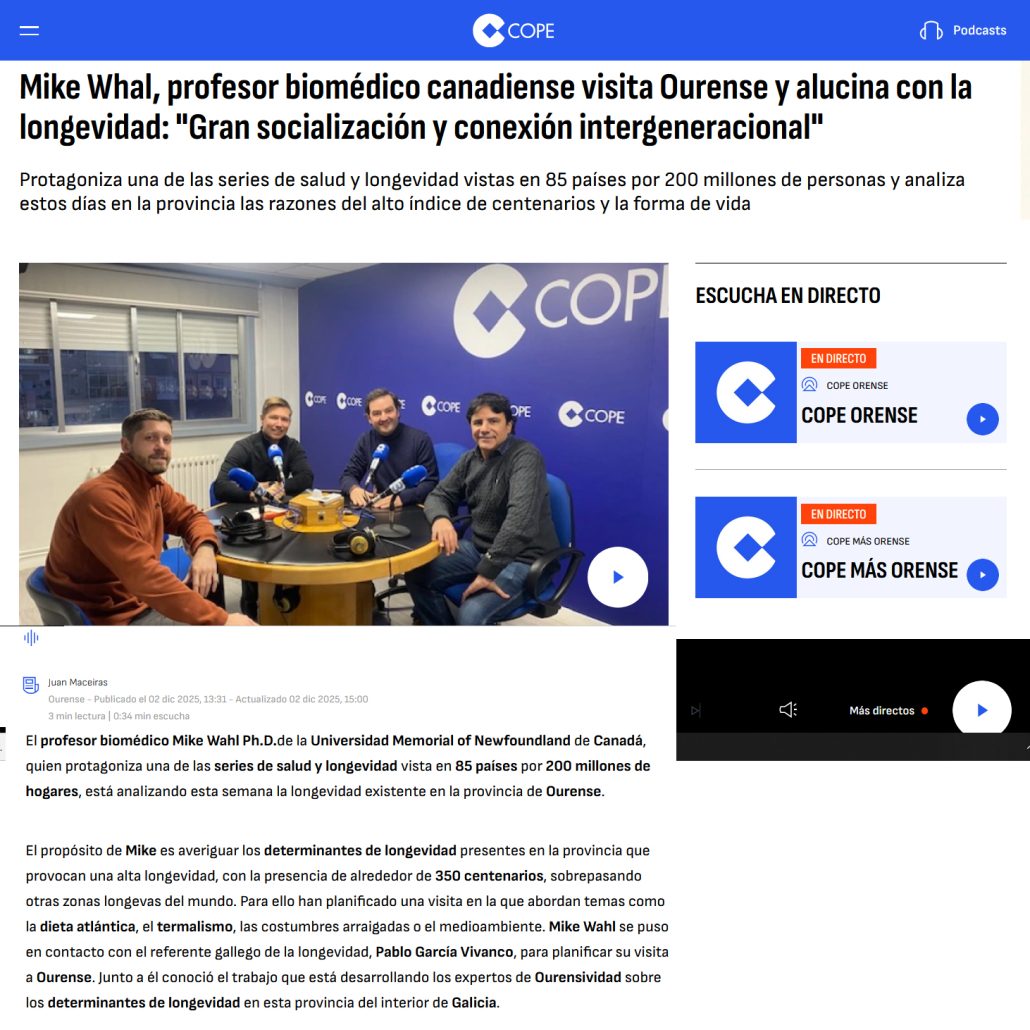 Bajo el título: “Mike Whal, profesor biomédico canadiense visita Ourense y alucina con la longevidad: «Gran socialización y conexión intergeneracional»”, la cadena de Radio Cope Ourense, Juan Maceiras, entrevista en su programa a Mike Whal, profesor biomédico canadiense visita Ourense y alucina con la longevidad: «Gran socialización y conexión intergeneracional».